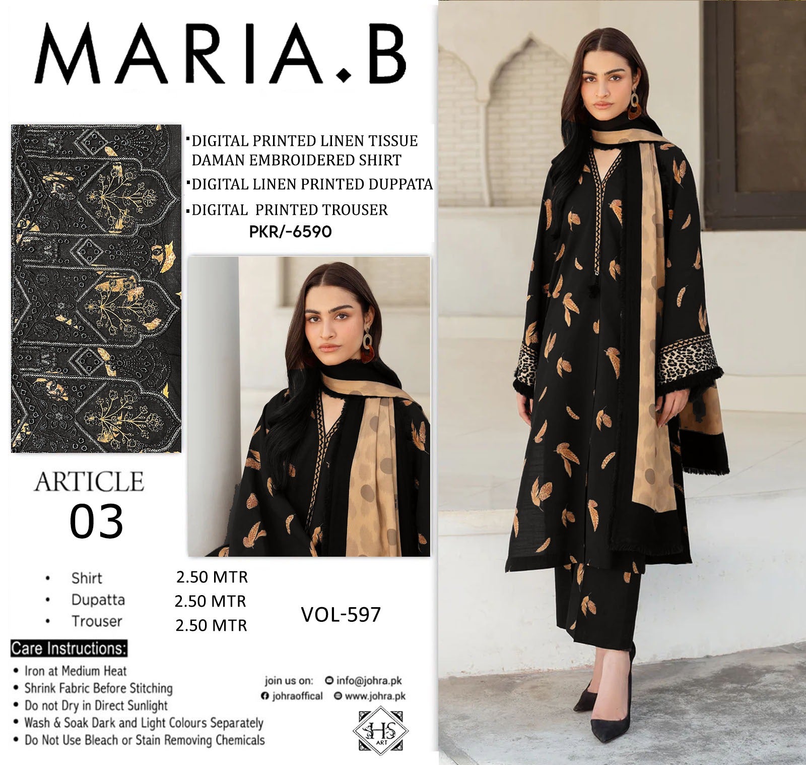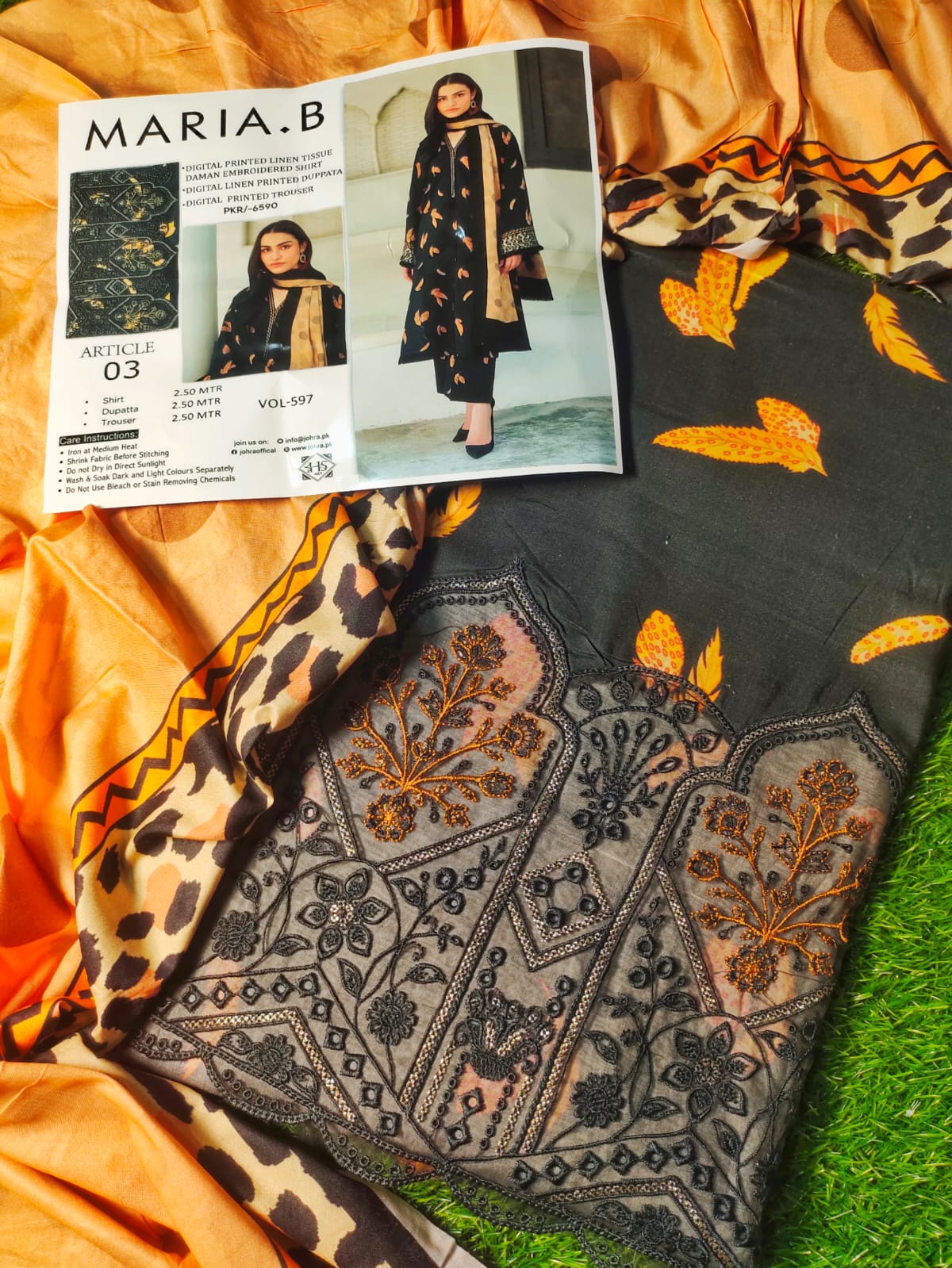 This set features a digitally printed linen shirt with allover designs on the body, sleeves, and trousers. The daman is enhanced with embroidered detailing, complemented by an attached tissue patch. The ensemble is completed with a digitally printed linen dupatta, ensuring a cohesive and refined look.