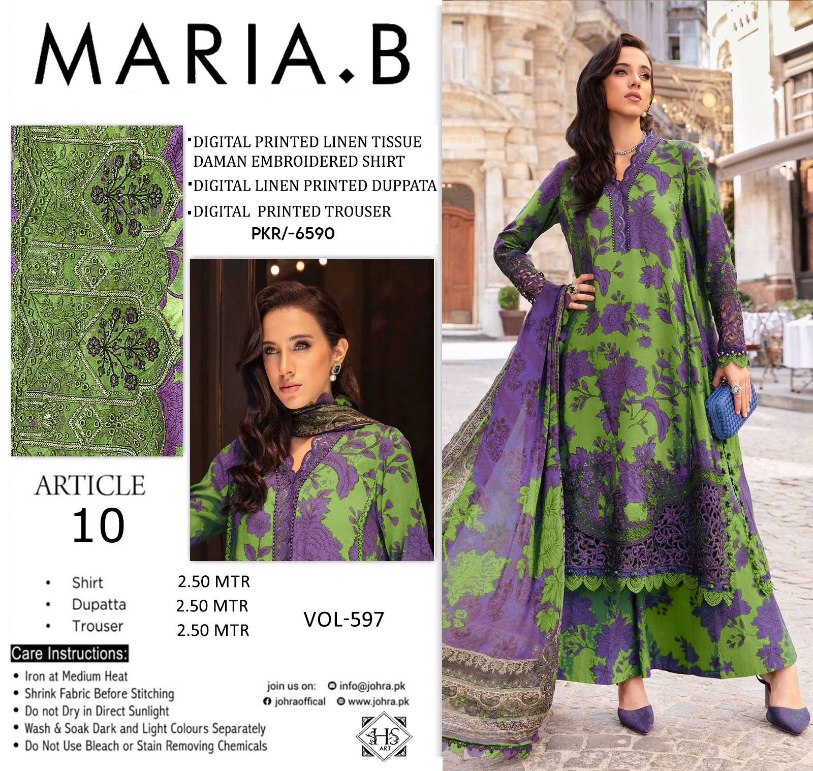 This set features a digitally printed linen shirt with allover designs on the body, sleeves, and trousers. The daman is enhanced with embroidered detailing, complemented by an attached tissue patch. The ensemble is completed with a digitally printed linen dupatta, ensuring a cohesive and refined look.