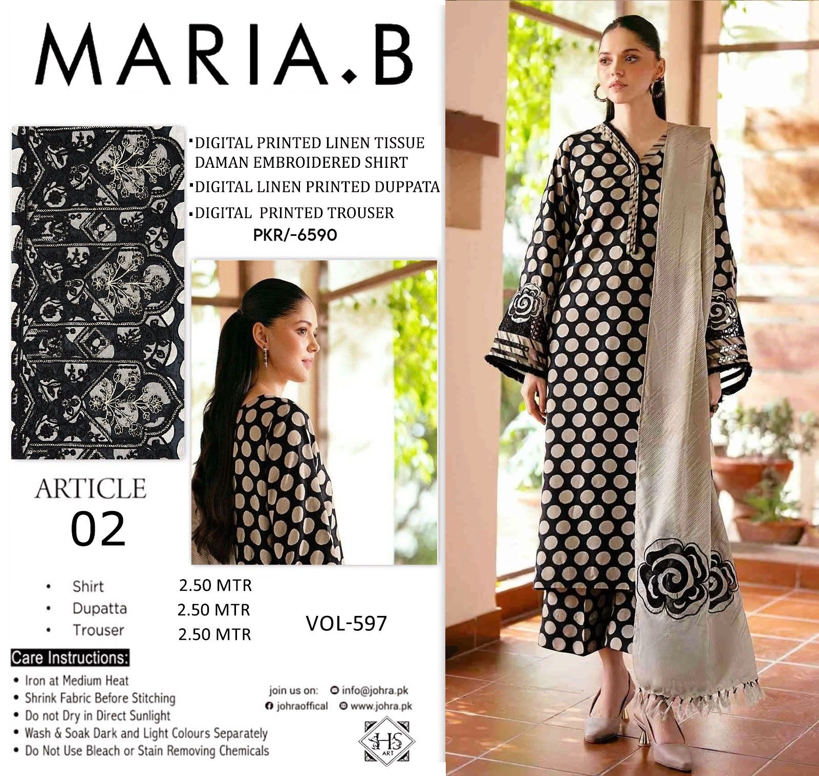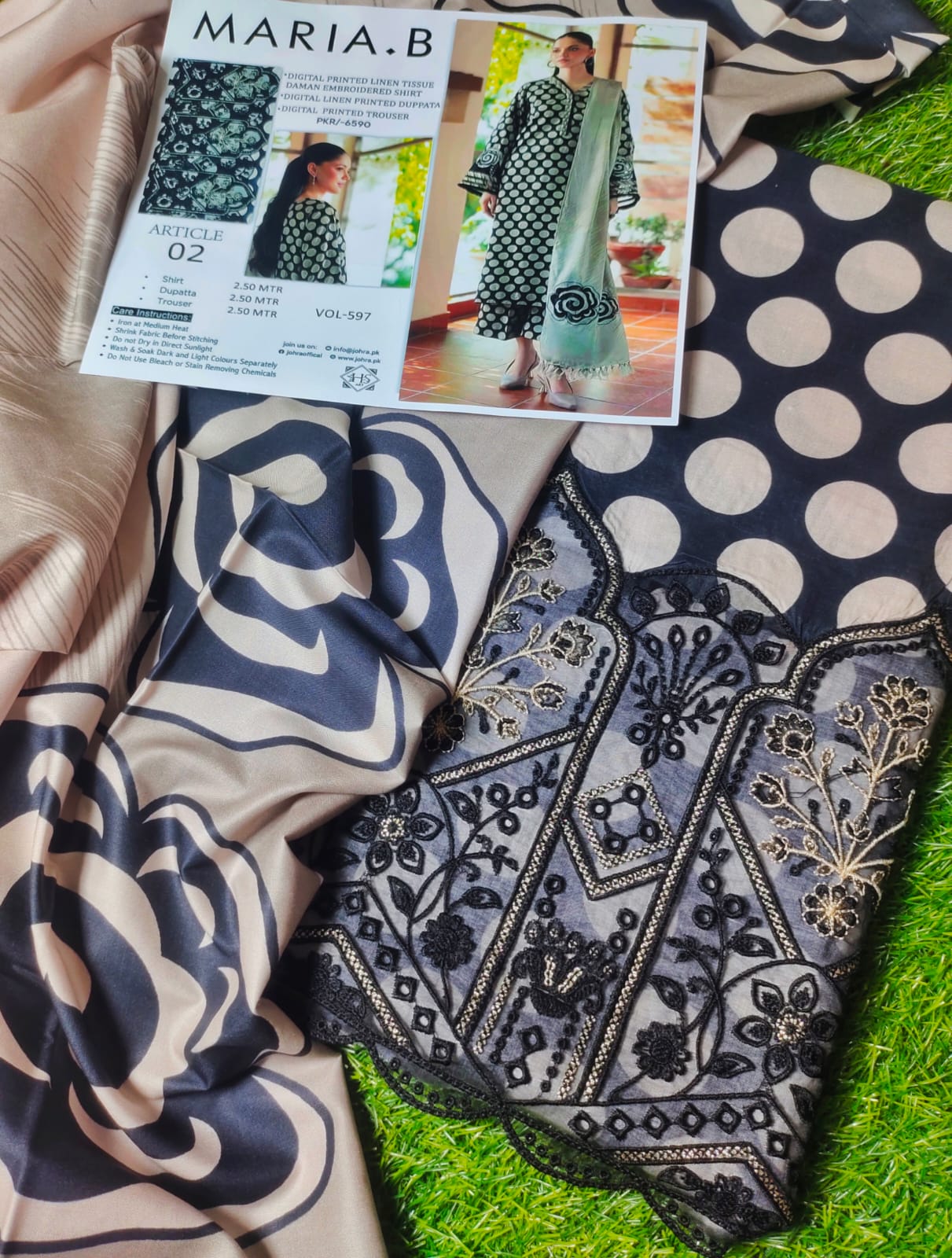 This set features a digitally printed linen shirt with allover designs on the body, sleeves, and trousers. The daman is enhanced with embroidered detailing, complemented by an attached tissue patch. The ensemble is completed with a digitally printed linen dupatta, ensuring a cohesive and refined look.